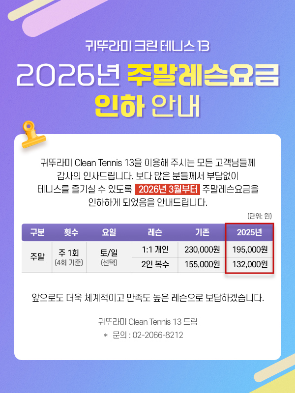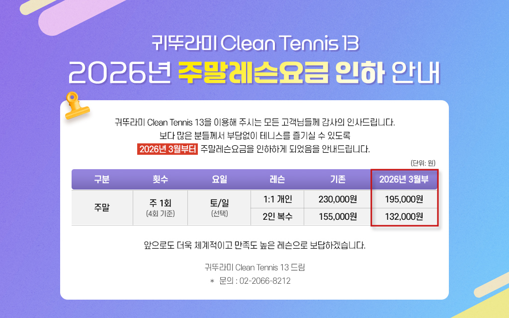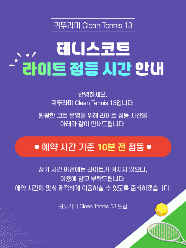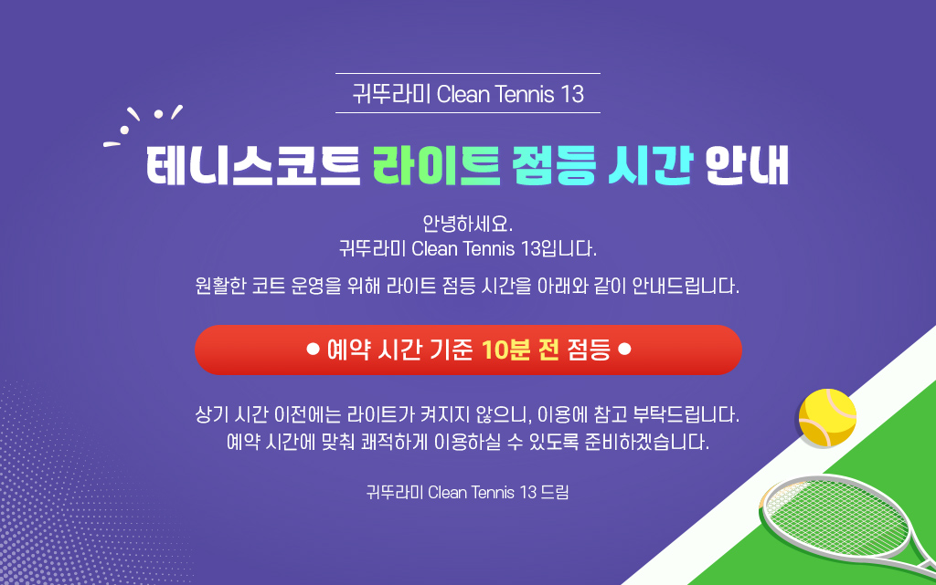 저희 코트를 이용해 주시는 모든 고객님들께 감사의 말씀드리며, 좀 더 여유로운 코트 이용을 제공해 드리기 위해