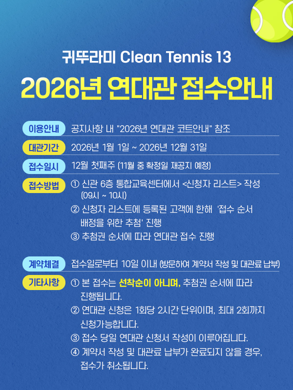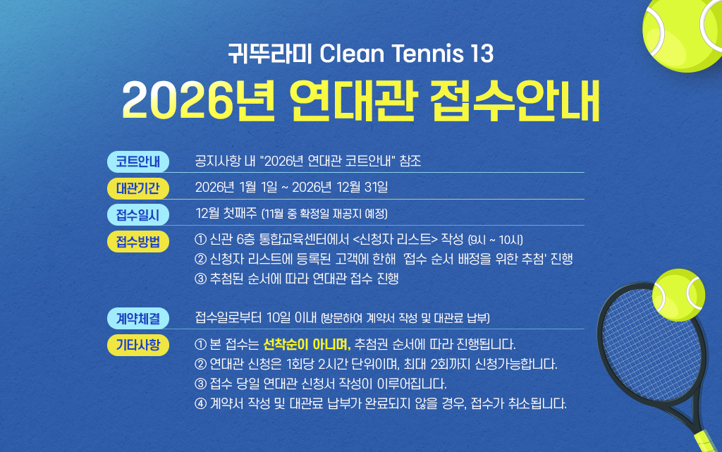 2026년에 연대관을 희망하시는 고객님들께서는 아래의 코트 현황을 참고하시기 바랍니다