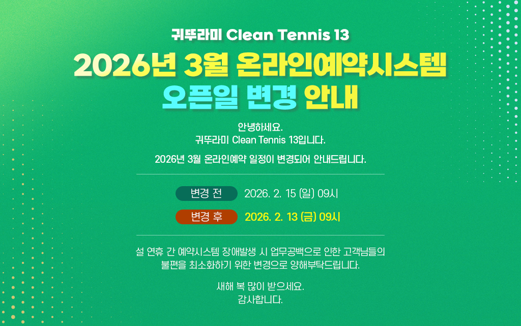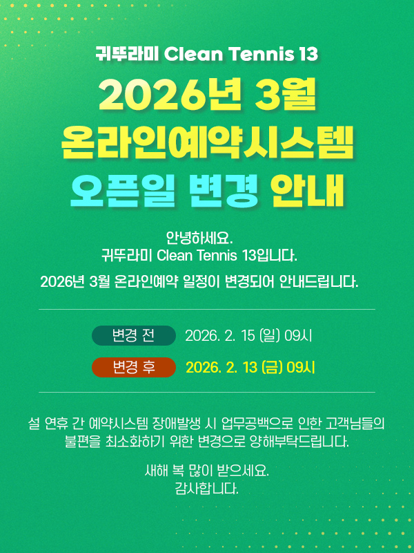 저희 코트를 이용해 주시는 모든 고객님들께 감사의 말씀드리며, 좀 더 여유로운 코트 이용을 제공해 드리기 위해